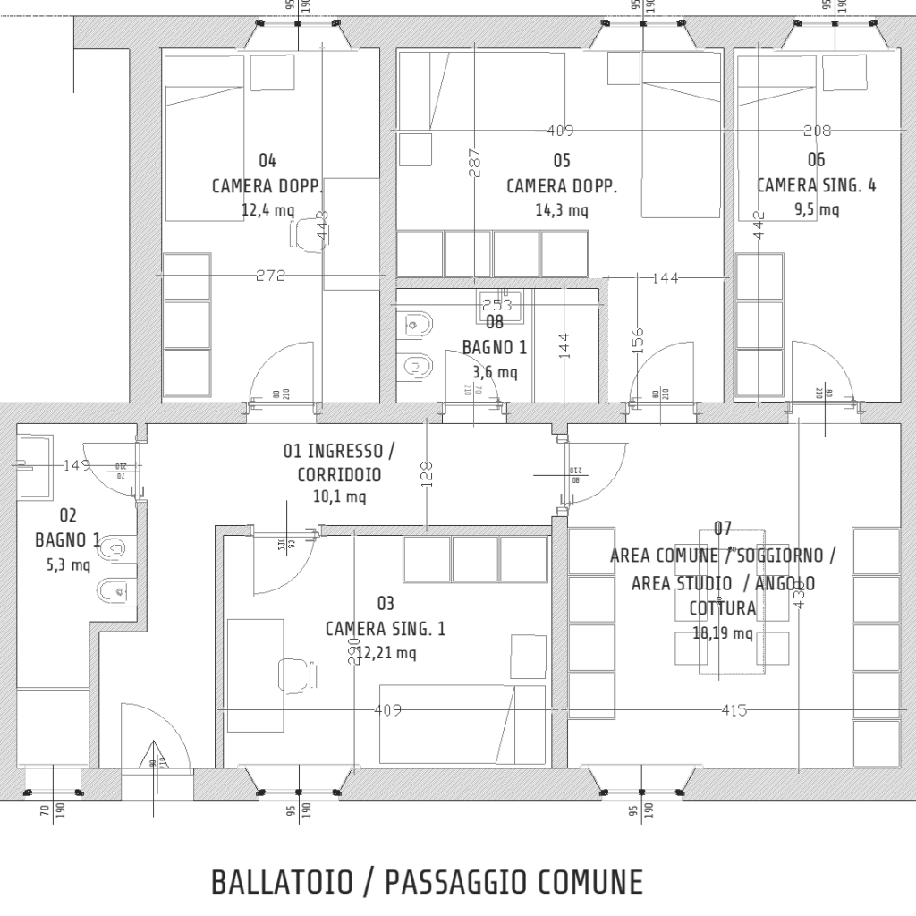 Appartamento piano primo sinistra, con un corridoio centrale sul quale si sviluppano sei camere singole (di cui due per diversamente abili), una camera doppia, tre bagni (di cui uno per studenti diversamente abili), soggiorno-cucina